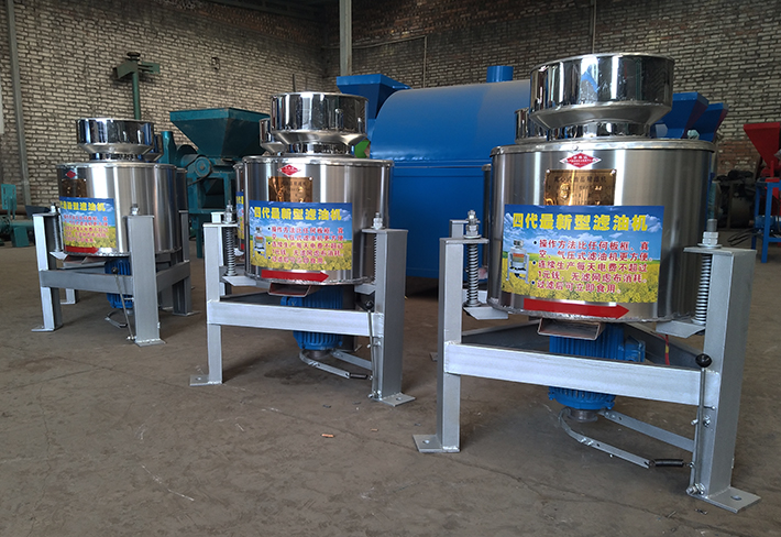 毛油油溫在60度就可過濾,如果油溫過高不可進行過濾,因為加入鹽水油容易溢出來。將鹽水倒入毛油中,攪拌均勻,放置3-5分鐘,(這樣做是為了使鹽水和毛油可以被溶解分離。),然后倒入離心濾油機內,開啟電源使設備運轉2-4分鐘,然后關閉電源,待轉鼓停止后過濾后的油從出油管處流出。清理油渣時把漏油斗直接打開,用鏟子在中間孔清理內壁上的油渣,使用一段時間后,再把里外桶打開,把油桶中間分油盤螺栓卸開,然后將內桶提出,清理外桶內流出的細渣,然后把內桶裝上。